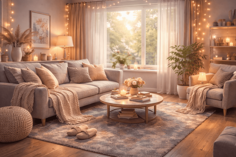 - Свечи и подсветка — создают мягкий свет и ощущение тепла.